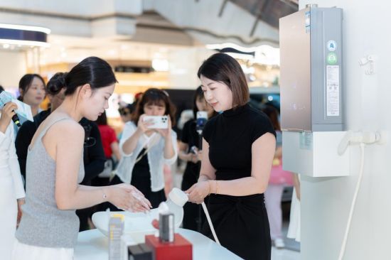 此次快闪活动形式丰富、有趣实用。围绕在“高透活肌体验”互动区,消费者扫码关注华帝官方账号后,工作人员便会使用美肌浴为其净手。